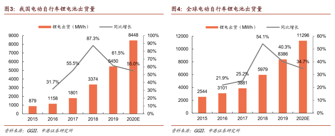 电动两轮车普遍以铅酸电池为主,锂电池渗透率正在提升。2019年我国电动自行车锂电池装机量为5.45GWh,同比增长61.5%,市占率达到13.2%,同比提升1.8 pct。随着三年过渡期最终期限的临近,未来电动自行车市场的锂电渗透速度会显著加快,预计2020年锂电渗透率将达到20%左右。
