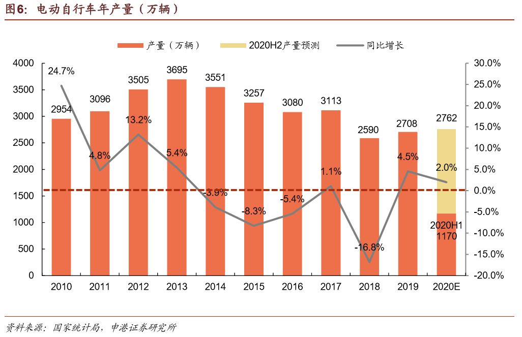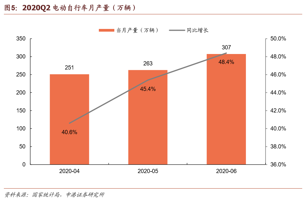 电动自行车市场快速复苏,ToB端需求空间大。2020H1电动自行车完成产量1170.1万辆,同比增长10.3%。疫情后电动自行车市场快速复苏,自4月起连续同比大幅增长,主要原因在于共享单车、外卖、快递等服务业的迅猛发展,ToB端需求增强,拉动整体销量。