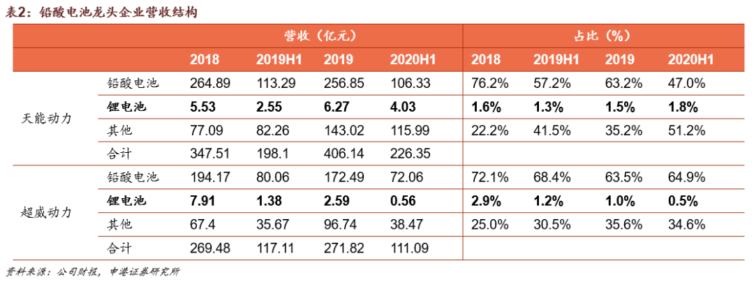 天能动力2020H1铅酸电池营收106.3亿元,占当期总营收比例47%,锂电池营收4.03亿元,占比仅1.8%;