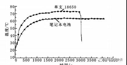 由图1可以看出,两组电池的最高温度分别为73.3℃和65.1℃,虽然这样的温度并不会使电池发生燃烧爆炸,但是因为其持续放热,对于大电容的电池组来说,如果不能及时将热量散发出去,将可能导致火灾甚至爆炸 。