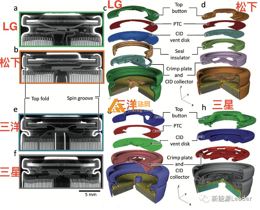 下图为三洋、松下和三星的18650电池在发生热失控后电池上盖的三维结构,从下图中能够看到三洋和松下的18650电池在发生热失控后,中心针都在气体的推动下穿破电池上盖,为气体扩散提供了通道(视频7为松下电池)。