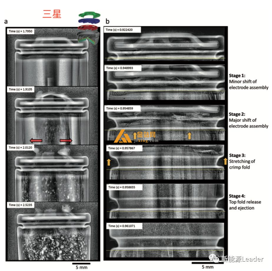 作者发现在相同的测试制度下,三星的7只18650电池中有两只发生了爆炸,其余的5只正常的通过防爆阀释放压力。如果多宝电竞仔细观察三星18650电池的整个爆炸过程(如下图所示)可以看到4个过程