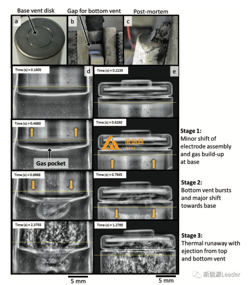 从上面的分析不难看出虽然18650电池设计有防爆阀,希望在电池热失控过程中及时泄压,但是在实际的热失控过程中往往由于电芯堵塞防爆阀,引起电池无法泄压,引起电池爆炸,大量的活性物质向周围扩散,这可能会造成热失控在电池组内部的扩散。为了解决这一问题,作者在18650电池的底部设计了第二个泄压阀(如下图a所示),在热失控过程中产生的气体通过上下两个防爆阀快速释放,避免气体积聚,防止电池爆炸。通过高速视频(视频14、15、16)多宝电竞能够看到电池的热失控分为以下三个步骤。