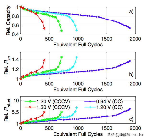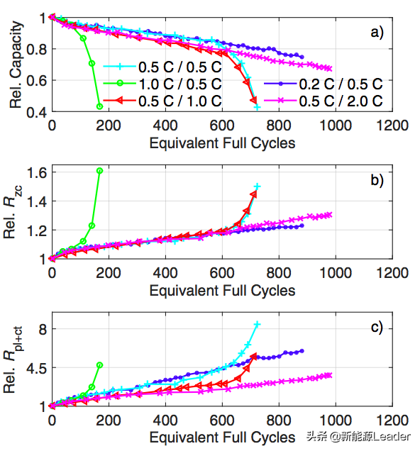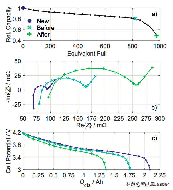 从下图b和c能够看到电池的欧姆阻抗和电荷交换阻抗的增加与电池可逆容量衰降之间存在非常密切的相关性,因此多宝电竞可以通过BMS系统对电池内阻变化的跟踪实现对非线性衰降的预测。