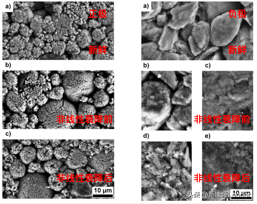 从前面的分析不难看出循环过程中负极SEI膜生长导致负极的动力学性能变差,引起负极表面析锂是导致锂离子电池非线性衰降的主要因素,因此作者分析了循环前、非线性衰降前和非线性衰降后的正负极表面形貌,从图中多宝电竞能够看到正极的形貌在这一过程中几乎没有发生明显的改变,而负极的形貌在非线性衰降前已经能够在活性物质颗粒表面观察到一层薄薄的SEI膜,部分区域能够观察到较厚的SEI膜,而在非线性衰降后负极颗粒表面已经出现了明显的SEI膜,而很多区域也都出现了非常厚的SEI膜。这也再次验证了多宝电竞之前的推测——负极SEI膜持续生长导致的动力学条件变差引起的负极表面析锂是导致锂离子电池非线性衰降的主要因素。